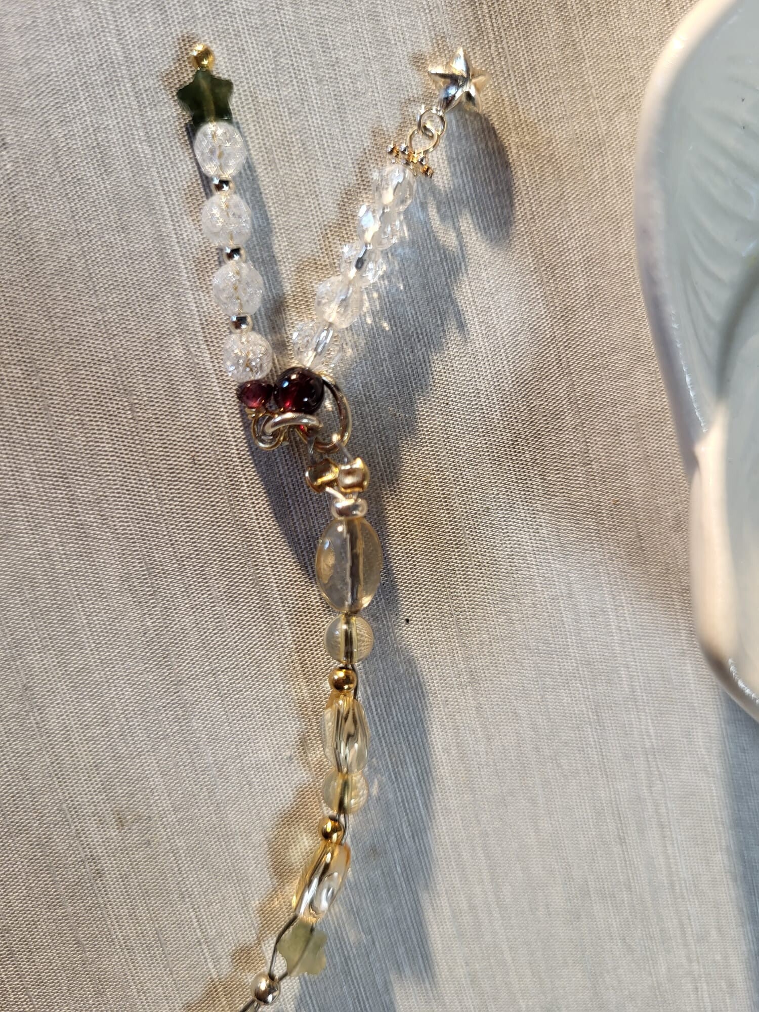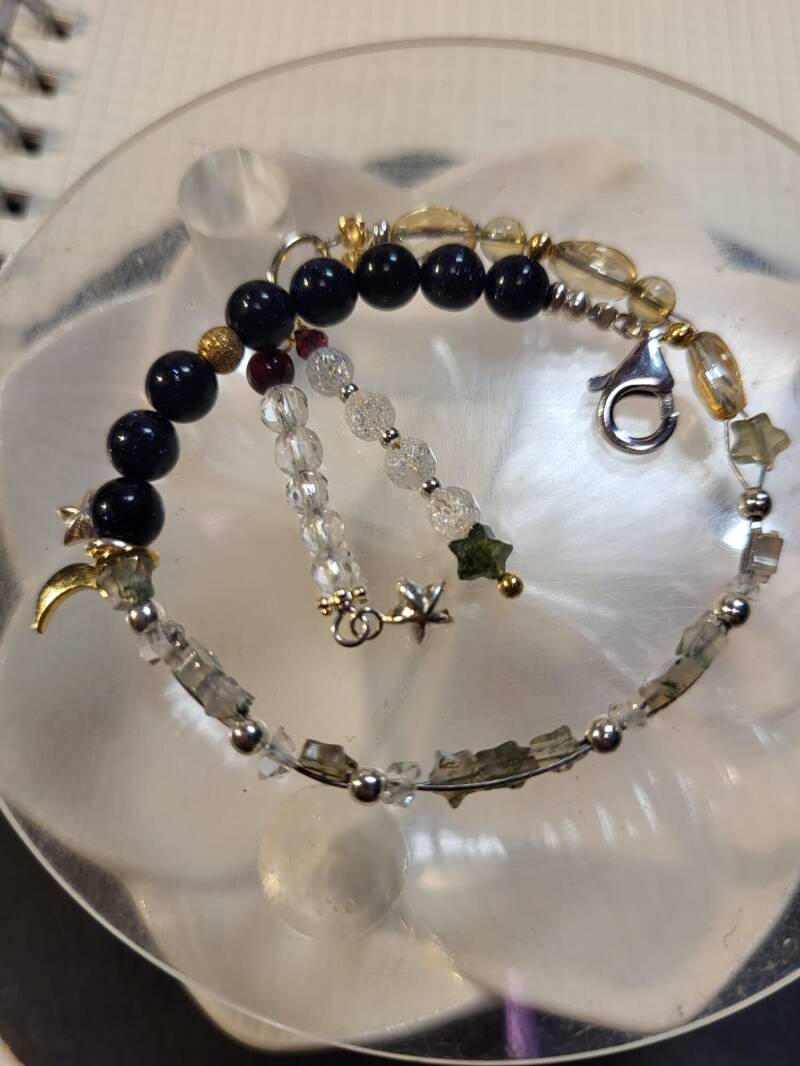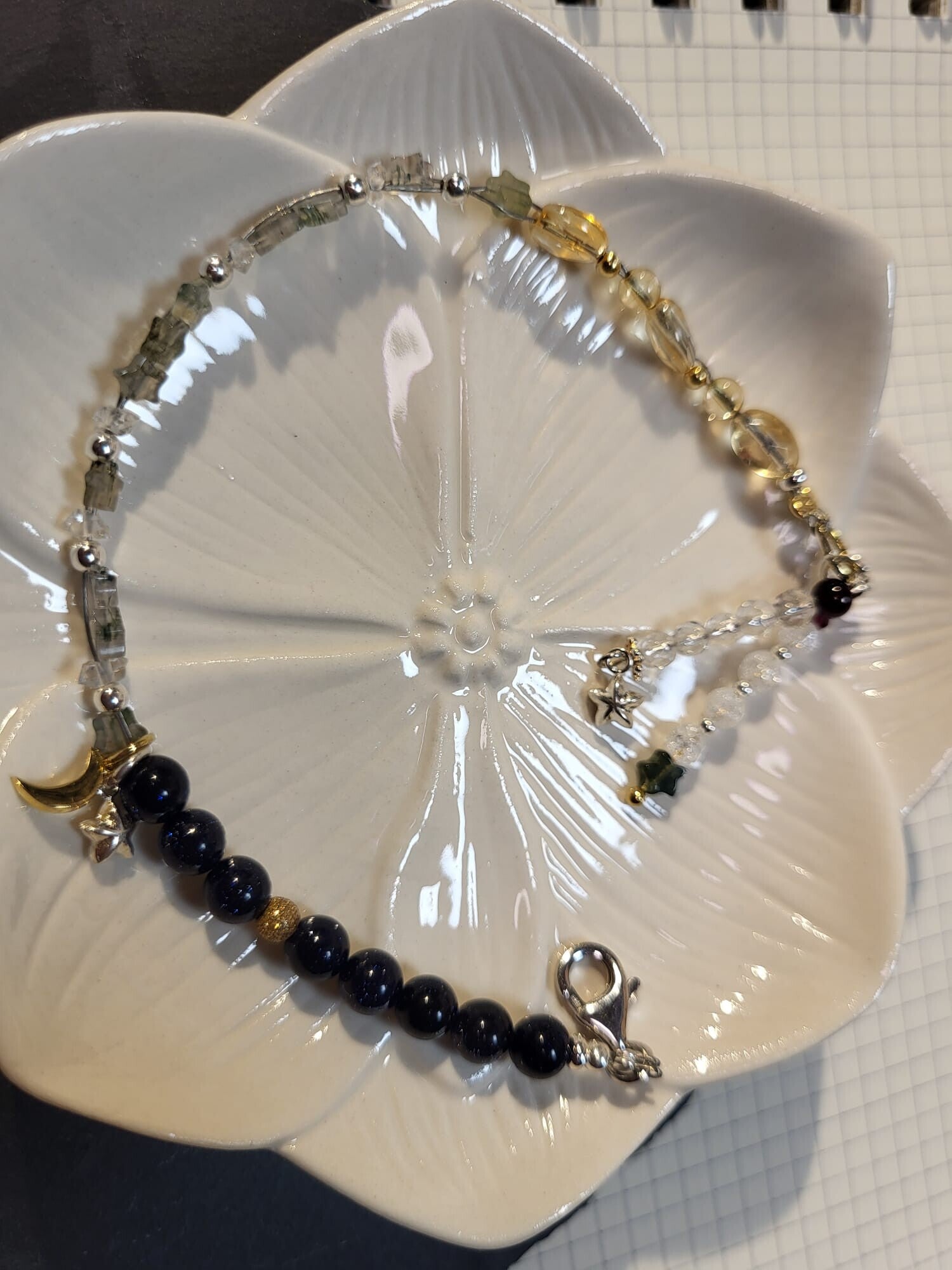 Blaufluss wie die Nacht und Citrin für das Funkeln der Sterne. Ein seltenes Einzelstück mit wohltuenden, ausgesuchten Mineralsteinen, als Unikat gemacht. Die kleine Sternschnuppe ist auch im Shop zu finden.