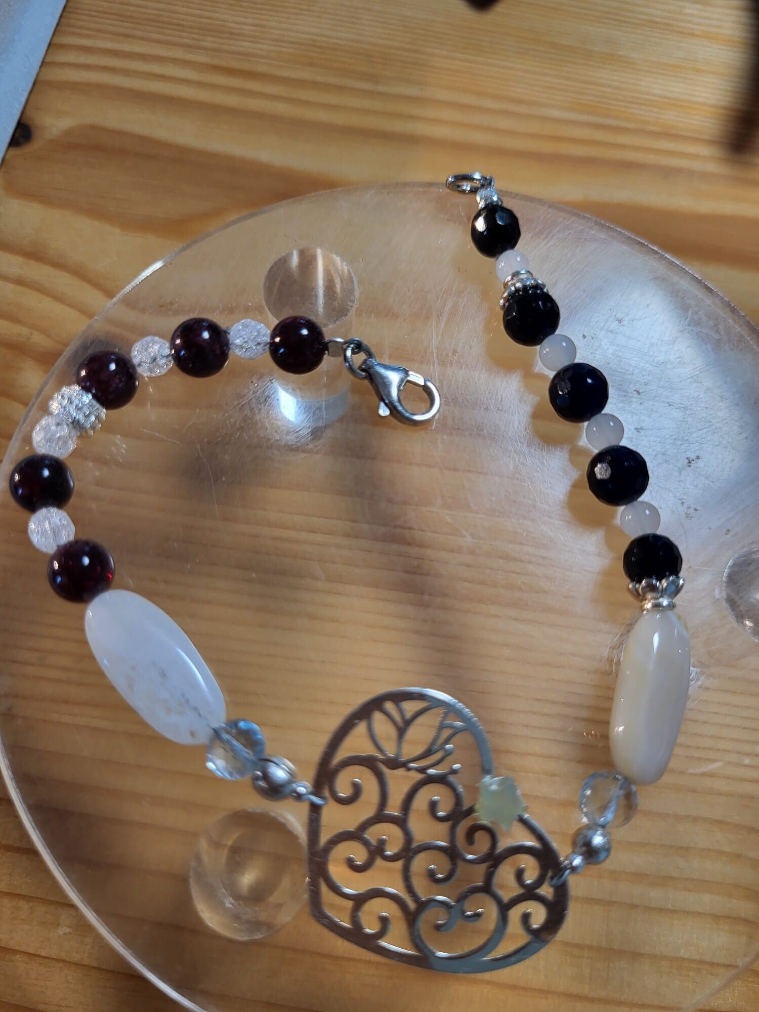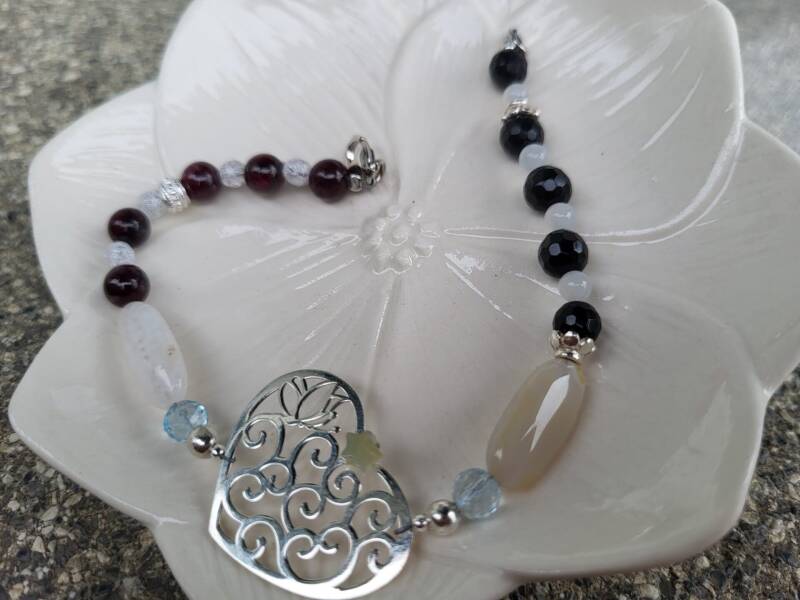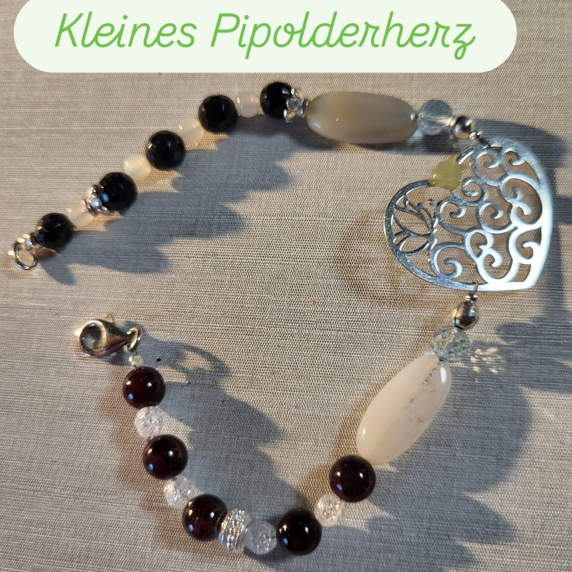 Ein Stück mit Silberherz, dass einen kleinen Pipolder (Schmetterling) gehalten auf geschwungenen Ranken zeigt. Obsidian fac mit Mondstein zusammen und Granat mit der Iris des Bergkristalles. Zwei blaue Wassertopas halten das Herz. Süsser kann ein Geschenk nicht sein und wahre Liebe zeigen. Das kleine Pipolderherz ist ebenfalls im Shop zu finden.